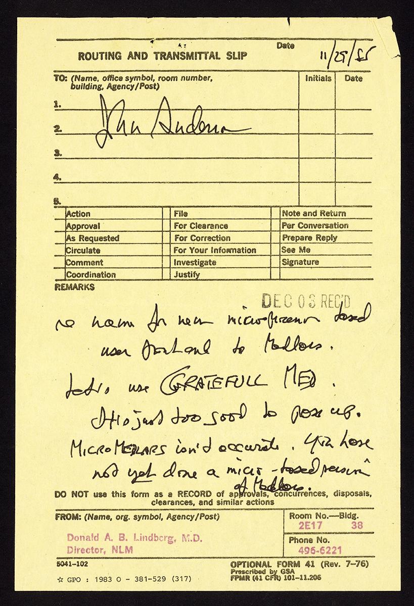 Grateful Med was a successful and important advancement to provide access to NLM resources, but perhaps the first thing people notice about it today is its name. Federal institutions, after all, aren’t known for naming their products after bands, particularly bands like Grateful Dead. The majority of proposed names were more predictable, including “MICROMEDLARS,” “PCMEDLARS,” and “NLMSEARCH.” These names generally alluded to the fact that the program ran on personal computers, known at the time as microcomputers. Several suggested names stick out, including “TALKING HEADS,” “DISCOMED,” and “GRATEFUL MED.” TALKING HEADS also referred to a band, and DISCOMED referred to disco music. However, as visible in the image of a memo below, Director Lindberg chose Grateful Med because, “It is just too good to pass up.” And, thus Grateful Med was given a pleasantly unexpected name.