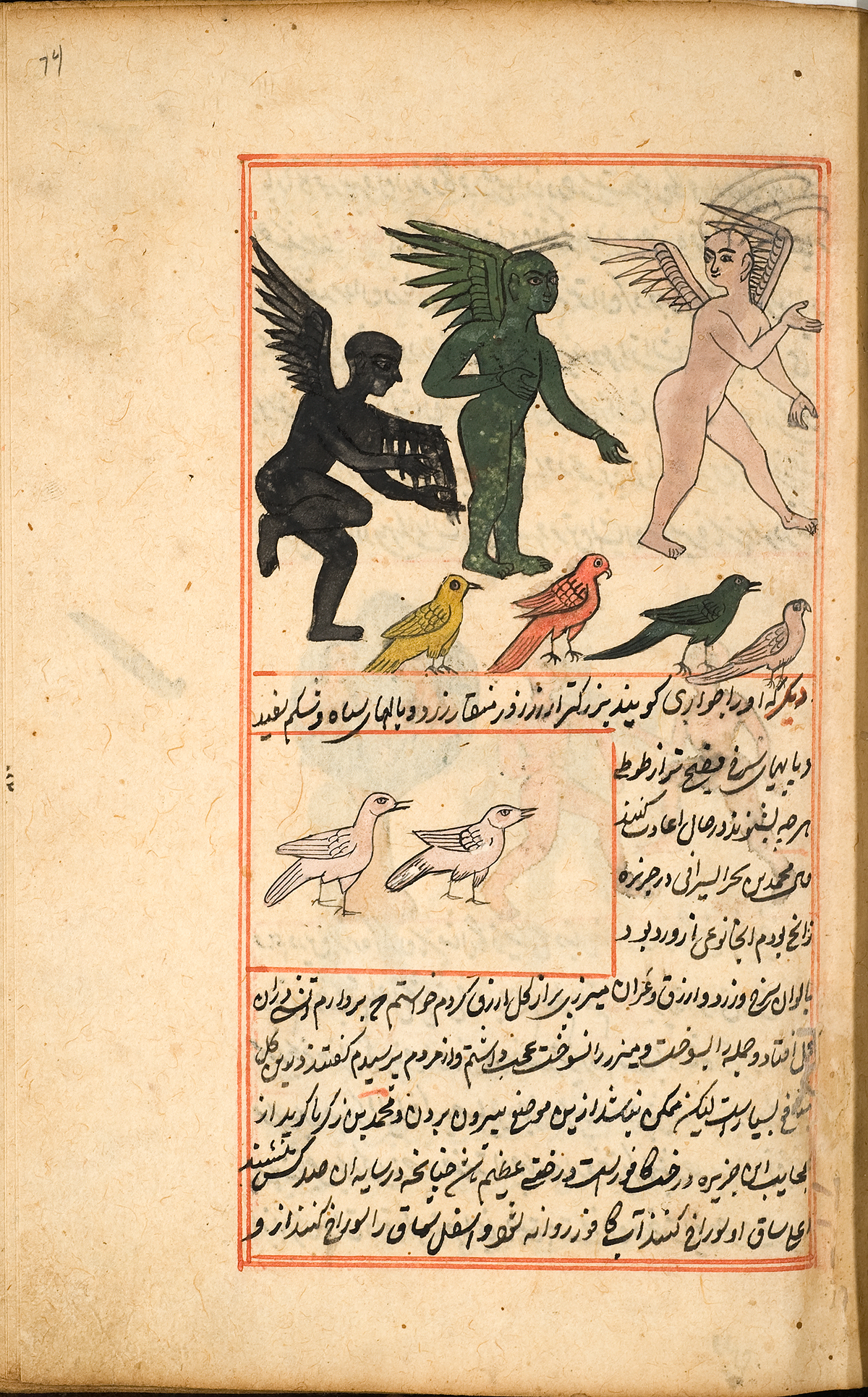 A page of handwritten text in Arabic with a red border and hand drawn and colored illustrations set into the text in red bordered boxes.