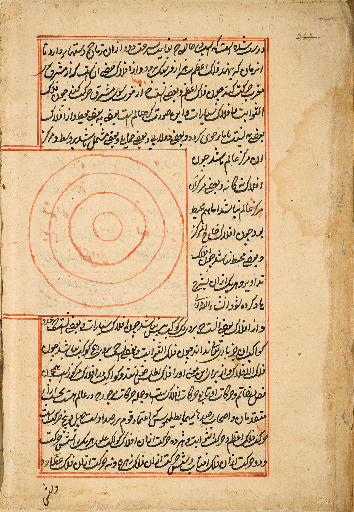 A page of handwritten text in Arabic with a red border and a hand drawn illustration of 4 concentric circles in red set into the text in a red bordered box.