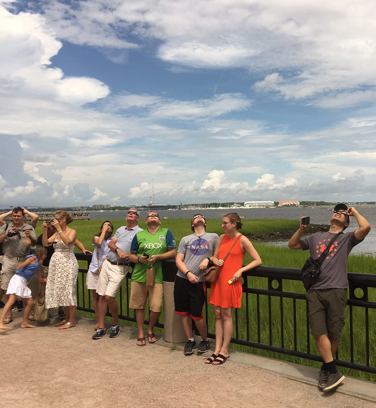 I saw many hundreds of others who converged on Charleston to see the eclipse looking skyward towards the sun wearing darkened solar- filtered glasses.