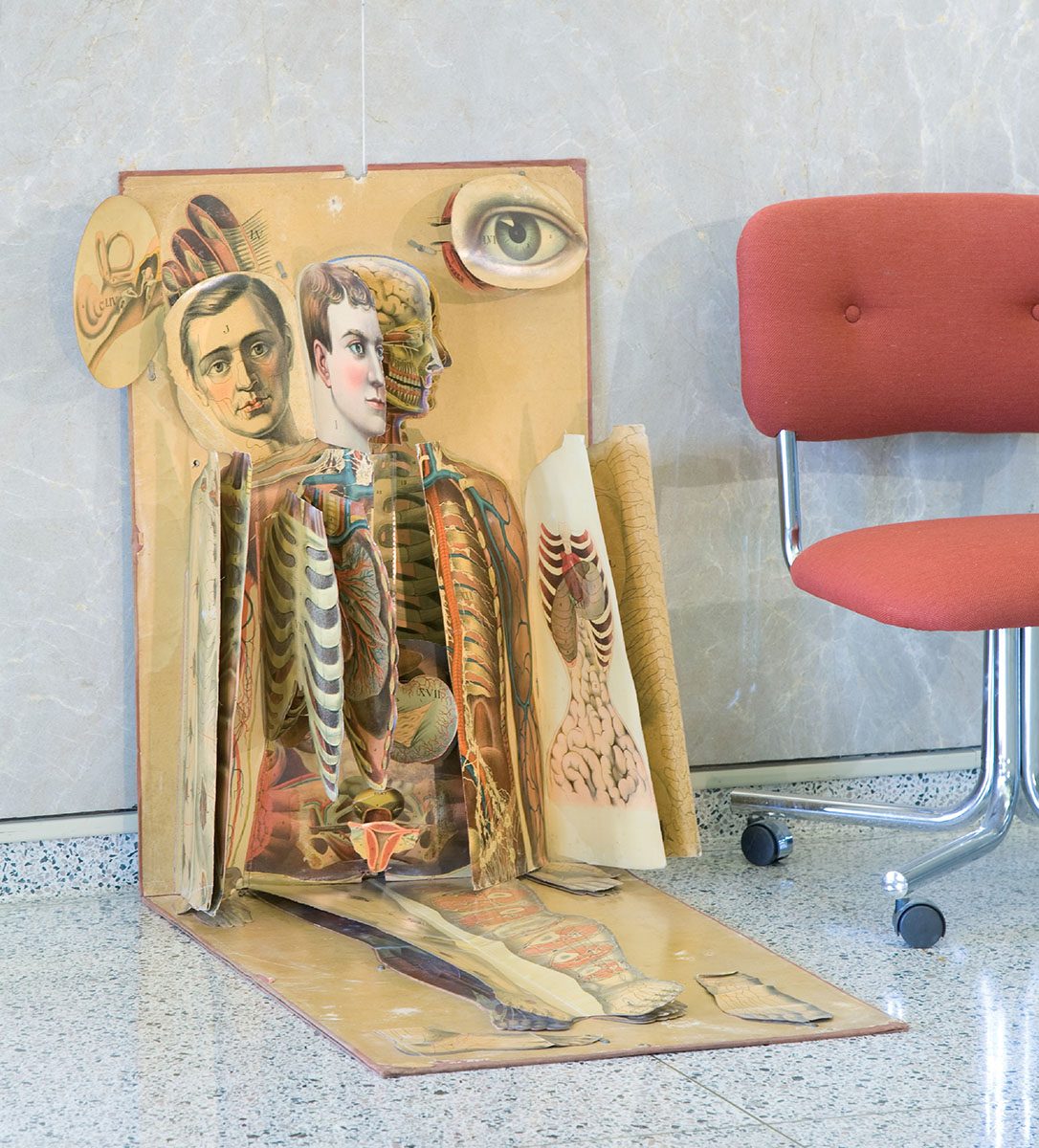 There he sits in retirement, still bearing the legend “Examined and Approved by Frank H. Hamilton, M.D.” (a prominent surgeon and one of the four physicians who attended President Garfield). But during his career, the life-size manikin worked standing up, or, more precisely, hanging from a hook. Then he sustained a wound: the stress of suspending his 8.2 pounds wore out the cardboard and he fell. It might have happened front stage at a medicine show, where a pitchman of nostrums was getting the suckers worked up by enumerating the “thousand natural shocks that flesh is heir to.” Or in a doctor’s office, where the manikin served as a 100-in-1 quick reference wall chart. Or in a classroom, where he bore witness to lectures on the respiratory system, first aid, or nutrition.